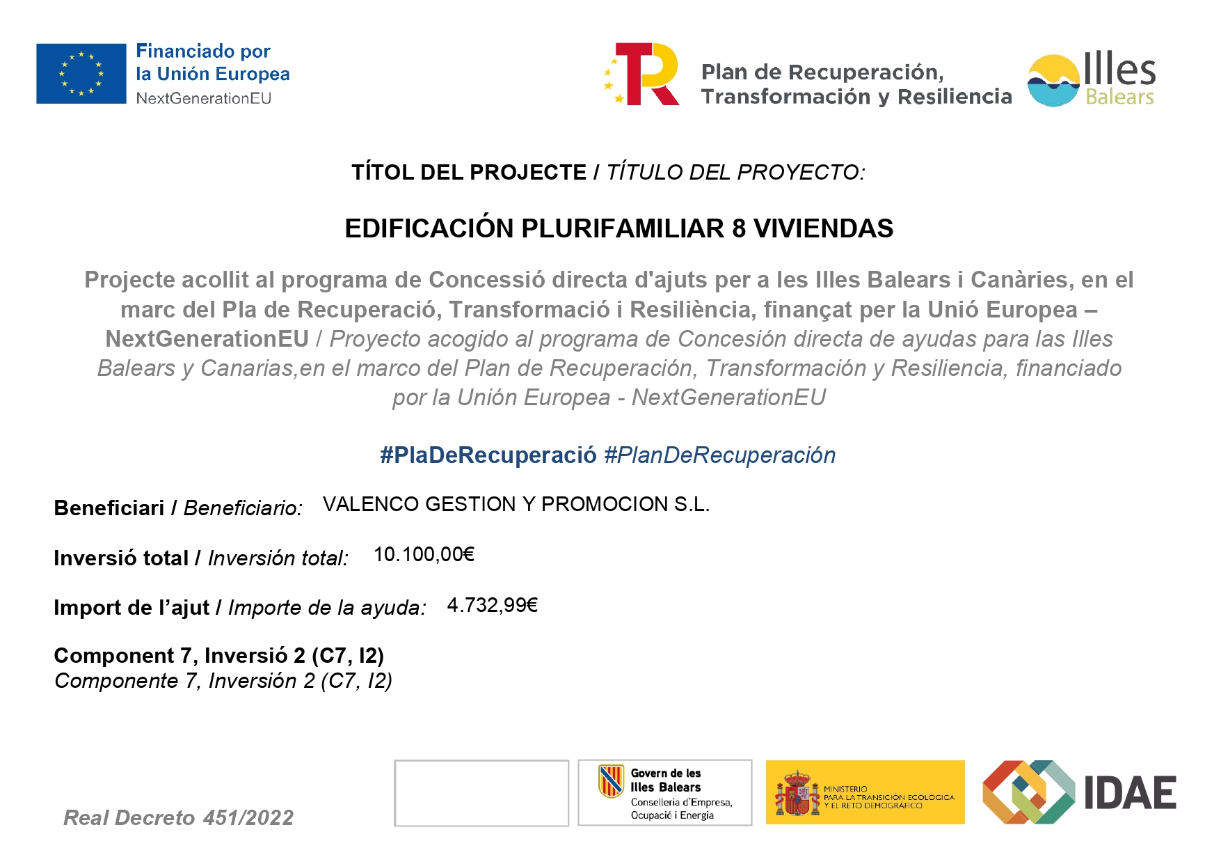 Este proyecto forma parte de las actuaciones impulsadas en el Pla d’Inversions per a la Transició Energètica de les Illes Balears (PITEIB), en el marco del Plan de Recuperación, Transformación y Resiliencia, financiado por la Unión Europea – NextGenerationEU. Gracias a esta ayuda, podemos implementar soluciones innovadoras que mejoran la eficiencia energética de nuestras instalaciones y reducen significativamente las emisiones de CO₂.